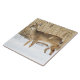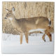 A white tailed deer stands in a snowy field with tall reeds in the background.