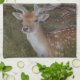 Close up photograph of a deer in a park printed on a kitchen towel.