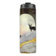Abstract landscape design in vibrant shades of silver, gold, and red with a moonrise, stars, and a deer.