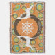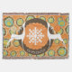 Beautiful Christmas holiday throw blanket features a background of vintage orange with colourful snowflake orbs, a ring of solid dark brown, and a centre of orange with tiny white polka dots and a big snowflake centre. Two white silhouette deer and pretty tree ornaments adorn this whimsical holiday throw and there's an area you can easily personalise with your family name.