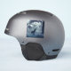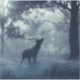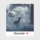 Contour sticker with a photo of a regal deer with antlers standing in a shadowy forest among sunlit trees. Snow falling all around.