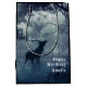Gift bag with a photo of a regal deer with antlers standing in a shadowy forest among sunlit trees. Snow falling all around.