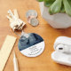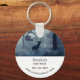 Keychain with a photo of a regal deer with antlers standing in a shadowy forest among sunlit trees. Snow falling all around.