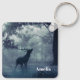 Keychain with a photo of a regal deer with antlers standing in a shadowy forest among sunlit trees. Snow falling all around.