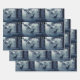 Wrapping paper sheets with a photo of a regal deer with antlers standing in a shadowy forest among sunlit trees. Snow falling all around.