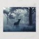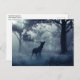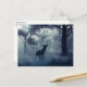 A postcard with a photo of a regal deer with antlers standing in a shadowy forest among sunlit trees. Snow falling all around.