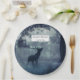 Paper plates with a photo of a regal deer with antlers standing in a shadowy forest among sunlit trees. Snow falling all around.
