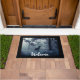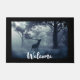 A welcome doormat with a photo of a regal deer with antlers standing in a shadowy forest among sunlit trees. Snow falling all around.