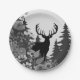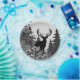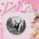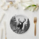 Deer emerges from pine trees and is surrounded by wildflowers in simple wildlife design.