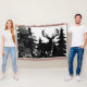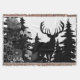 Deer emerges from pine trees and is surrounded by wildflowers in simple wildlife design.