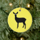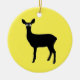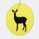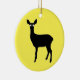 A silhouette of a deer standing sideways but looking toward the viewer. The deer has big bright white lights instead of eyes.