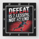 This black wall clock features the motivational text "DEFEAT IS A LESSON, NOT AN END" in a bold white font with a red outline and dynamic horizontal lines. Below the text is a graphic of a runner, who appears to be a light-skinned individual with short brown hair, in motion against a background with red and orange streaks suggesting speed and overcoming obstacles. The design encourages a positive perspective on setbacks.