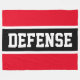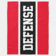 This sporty design features athletic DEFENSE text inside a black centre stripe highlighted with white pinstripes against bright red outer stripes.