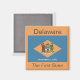 An authentic fine quality image of the flag of Delaware set between the state name and nickname over a light flag-colour background.