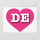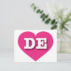 This postcard features a vibrant hot pink heart containing the bold, white, upper case letters DE, the official abbreviation for Delaware, the first state. The reverse side of the card is blank, awaiting your handwritten sentiments or customised text.