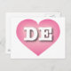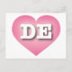This postcard features a calm, cool pink heart with a white-washed centre containing the bold white upper case letters DE, the official abbreviation for the state of Delaware, the first state. The reverse side of the postcard is blank awaiting your handwritten sentiments or customised text.