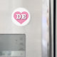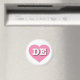 This magnet features a vibrant pink heart containing the bold, white, upper case letters DE, the official abbreviation for Delaware, the first state.