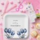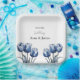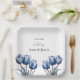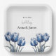 Elevate your reception or bridal shower with this sophisticated customisable Delft Blue Tulip Custom Wedding Paper Plate. This square plate features a detailed border of classic blue and white watercolor tulips, bringing a refined, European-inspired touch to your disposable dinnerware. Personalise the plate with the couple's names Anna & James, the wedding date 10.16.20XX, or the celebratory word Wedding.