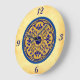 A decorative wall clock with a blue vintage design with blue numbers on a faux parchment background.. Click Customise It to add your name or message, change background colours, even save your design for later.