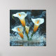 Delicate calla lilies with white petals and vibrant orange spadices, emerging from a serene water surface. As water splashes around them, droplets cling to the flowers, adding a fresh and vibrant look. Wisps of steam or mist swirl around the blooms, enhancing the ethereal quality of the scene. The background has a soft, muted tone, which helps to highlight the beauty and clarity of the flowers and the dynamic movement of the water. Overall, the composition evokes a sense of tranquillity and elegance.