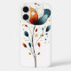 An abstract floral stem in orange, navy, and red hues dances upward with scattered dots—elegant and lively with a touch of whimsy.