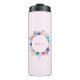Delightful watercolor floral wreath design featuring delicate blooms in pink, purple, and blue, accented with metallic gold leaves on a soft pink background. This feminine and romantic design is lovely for fems of any age. Personalise with a name.