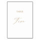 This delicate gold calligraphy table five table number is perfect for a modern wedding. The romantic minimalist design features lovely and elegant champagne golden yellow typography on a white background with a clean and simple look. The card prints on the front and back (double-sided). Other table numbers in the collection are sold separately.