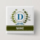 A delicate ivy wreath with a blue striped bow is layered over a fresh white background. Wedding appropriate design features the monogram "D" in blue. Button can be personalised with any name over the green ribbon banner. Design tip: For the font shown here, use all caps for the name.