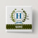 A delicate ivy wreath with a blue striped bow is layered over a fresh white background. Wedding appropriate design features the monogram "H" in blue. Button can be personalised with any name over the green ribbon banner. Design tip: For the font shown here, use all caps for the name.
