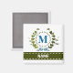 A delicate ivy wreath with a blue striped bow is layered over a fresh white background. Wedding appropriate design features the monogram "M" in blue. Magnet can be personalised with any name over the green ribbon banner. Design tip: For the font shown here, use all caps for the name.