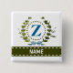 A delicate ivy wreath with a blue striped bow is layered over a fresh white background. Wedding appropriate design features the monogram "Z" in blue. Button can be personalised with any name over the green ribbon banner. Design tip: For the font shown here, use all caps for the name.