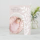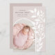 Chic and modern birth announcement features a single vertical/portrait orientated photo in an arched layout, with climbing vines of white botanical leaves along the right side. Personalise with your baby's name, birth date, and stats, and add a personal message to the back, along with an additional photo.