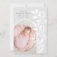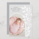 Chic and modern birth announcement features a single vertical/portrait orientated photo in an arched layout, with climbing vines of white botanical leaves along the right side. Personalise with your baby's name, birth date, and stats, and add a personal message to the back, along with an additional photo.