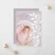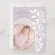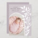 Chic and modern birth announcement features a single vertical/portrait orientated photo in an arched layout, with climbing vines of white botanical leaves along the right side. Personalise with your baby's name, birth date, and stats, and add a personal message to the back, along with an additional photo.
