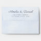 Elegant wedding envelopes invitation design featuring pink and white watercolor flowers on a light blue background. Envelope flap is customisable with return address.