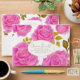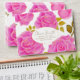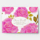 This design features large, radiant pink roses with delicate golden highlights, arranged gracefully over a pure white background. The contrast between the bright blossoms and the crisp white space creates a clean, elegant, and uplifting feel. Golden-green leaves add warmth and luxury to the floral composition, while the central oval frame outlined in gold provides a refined space for personalised text.