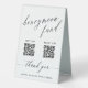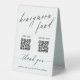 Elegant table tent wedding honeymoon fund sign with a combination of an elegant script and a classic traditional font, personalised with two QR codes and your names.