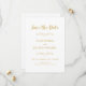 Elegant, delicate save the date cards in beautiful gold colour print are classic, formal and timeless. Borderless romantic design allows you to easily choose the paper shape for your engagement announcement. Two decorative flourishes each containing a single heart delicately envelope the name of the bride and groom. For optimal results skip lines and capitalise as in sample.