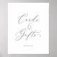 This delicate silver calligraphy cards and gifts sign is perfect for a modern wedding or bridal shower. The romantic minimalist design features lovely and elegant silver gray typography on a white background with a clean and simple look. The line of text at the bottom of the sign can be personalized with the date, the names of the bride and groom, or a short message like "Thank you". This sign can be used for a wedding or any event or party.
