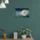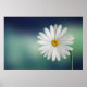 A serene photo of a single delicate with daisy. Soft dainty white petals with a bright yellow centre. The background is a misty greenish blue colour.