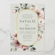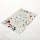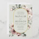 Elegant winter floral wedding invitations featuring your wedding details displayed in dark green lettering nestled inside of a gold foil oval floral frame with a sage green background. The winter flowers feature a colour palette of dusty rose, light pink, ivory, and soft golden yellow with eucalyptus leaves and winter foliage in shades of sage green and rich forest green.