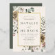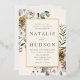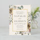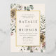 Elegant winter floral wedding invitations featuring your wedding details displayed in dark green lettering nestled inside of a boho floral and rectangular gold foil frame with an ivory background. The winter flowers feature a colour palette of dusty rose, light pink, ivory, and soft golden yellow with eucalyptus leaves and winter foliage in shades of sage green and rich forest green.