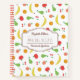 Chic spiral recipe notebook with a pattern of delicious fruit--bananas, apples, oranges, pears, cherries, and peaches--where you can add your name and the subject of the notebook on a charming label.