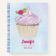 Spiral notebookwith an illustration of a delicious cupcake with pink swirls and a berry with leaves nestled in the frosting.