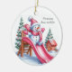 A delightful little snowman dressed in pink accessories on a bright pink playground slide. Christmas trees with decorations in the snowy backdrop. Message says 'I'm having Snow much fun. Add this ornament to your Pink Christmas decor.