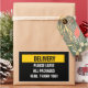 Notice to delivery people to please leave packages here at your desired location, along with a thank you. Attention getting yellow and white on black design with fully customisable text to alert your delivery people.