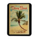 A uniquely retro mid-century modern Delray Beach Florida art print in vintage travel poster style. It features a curved palm tree on sandy beach with ocean under a blue cloudy sky.