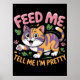 This humourous graphic features an adorable cartoon cat with a striking mix of purple and orange fur, depicted in a playful, crouching pose with one paw raised, and a happy, open-mouthed expression. Surrounding the demanding feline are small green leaves and various pink paw prints. The bold pink text at the top states "FEED ME," while the white text below clearly states "TELL ME I'M PRETTY," humorously encapsulating a cat's primary desires. The design is set against a solid black background. Digital download for personal use only.