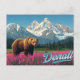 Striking vintage-style travel poster illustration featuring a grizzly bear standing in a field of vibrant purple wildflowers, set against the backdrop of snow-capped mountains (likely Denali/Mount McKinley) and pine forests. Captures the iconic wildlife and vast landscape of Denali National Park, Alaska. Excellent for wildlife enthusiasts, Alaska travelers, and fans of bold, retro nature art.