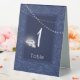 Denim and diamonds table tent decor.